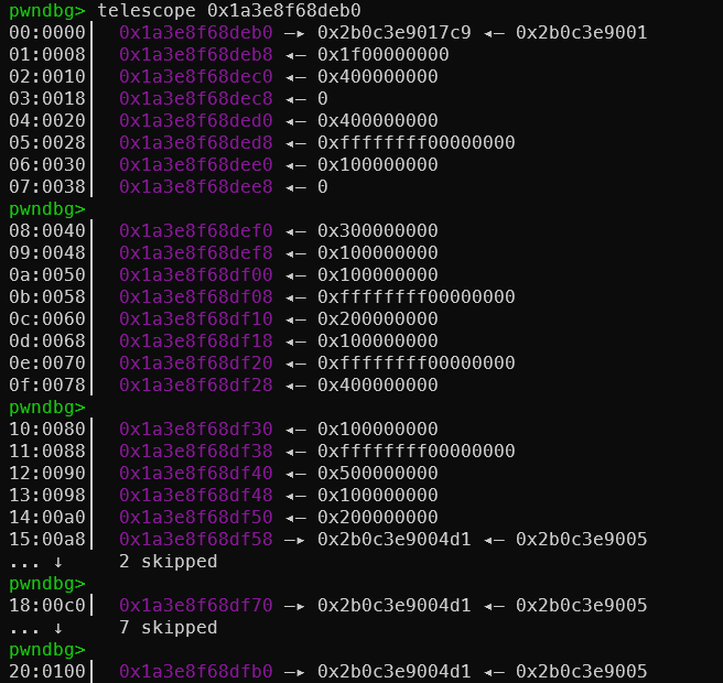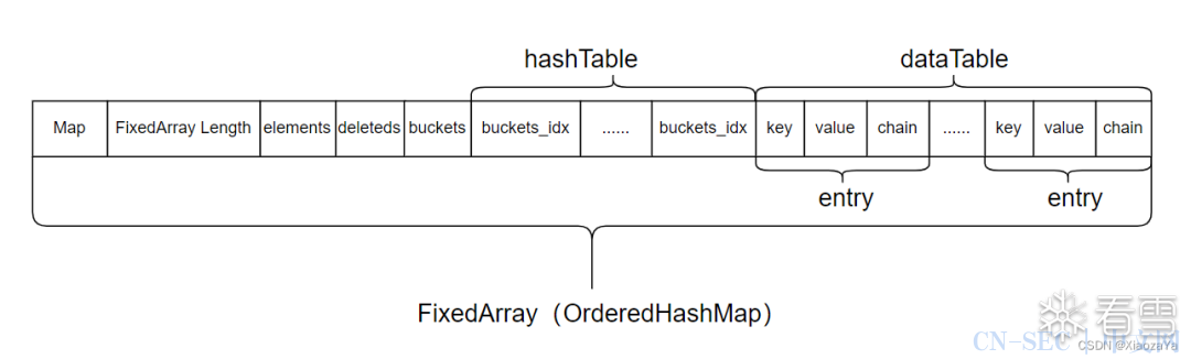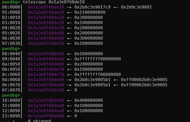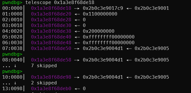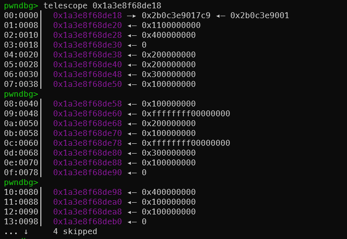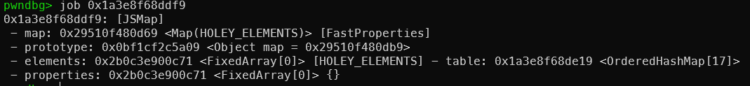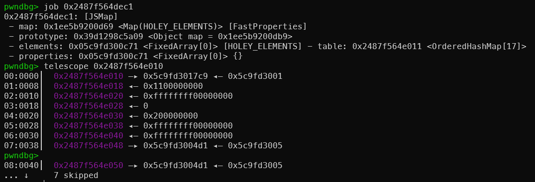 然后我们再添加新元素,此时:new_entry = &hashTable + buckets + (0 + 0) * 3 = hashTable[key1], 而key1我们可以控制,所以new_entry也是可控的,从而越界写key/value,这里一般就是去写JSArray的length字段。但是需要注意的是,在set操作中,当对bucket链表进行遍历时会进行检查,所以我们需要使bucket[hash(key) & (buckets - 1)] = -1从而避免遍历bucket链表。