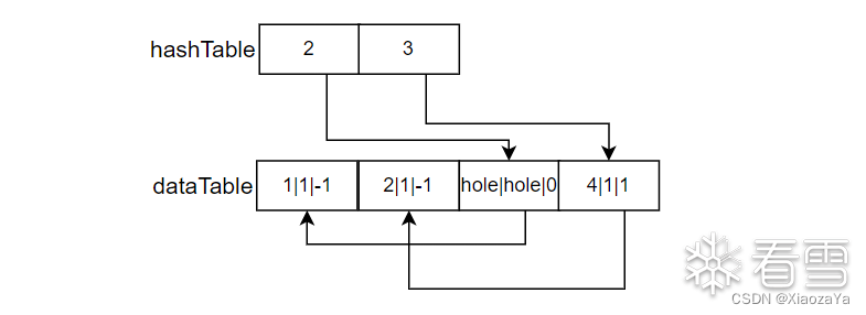 hashTable则变为了0x1, 0x0,0x3,然后发现dataTable内容中deleted_entry去除掉了。