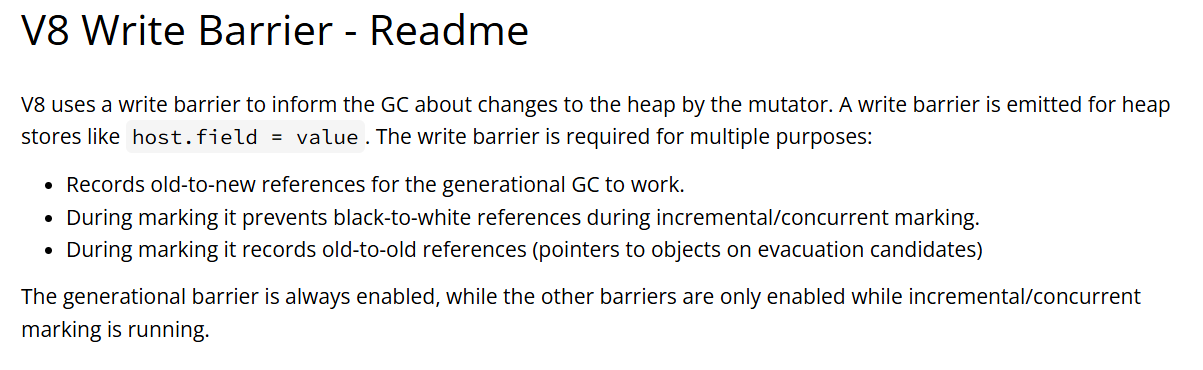 在垃圾回收(Garbage Collection, GC)中,write barrier(写屏障) 是一种机制,用于在程序运行时,监控和记录堆内存中对象引用的变化,以便垃圾回收器能够正确地管理内存。它是一个非常重要的优化技术,尤其是在现代垃圾回收器中,比如 V8 引擎的 GC。