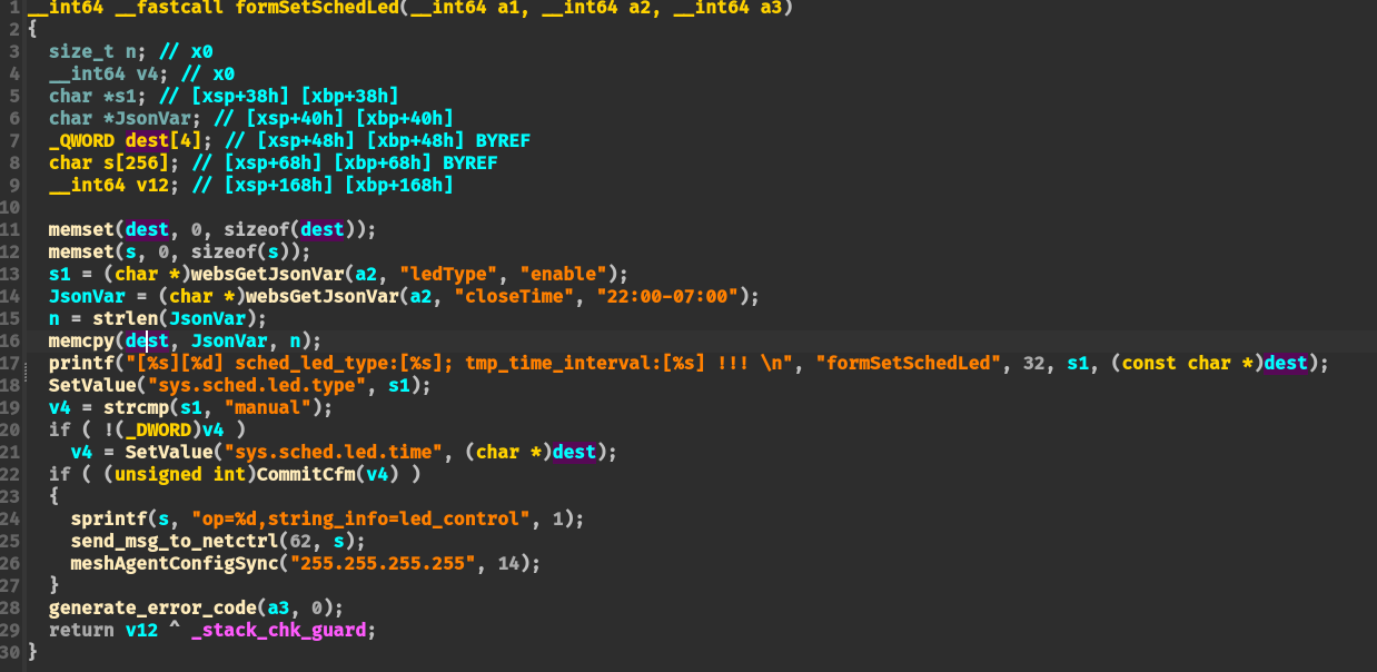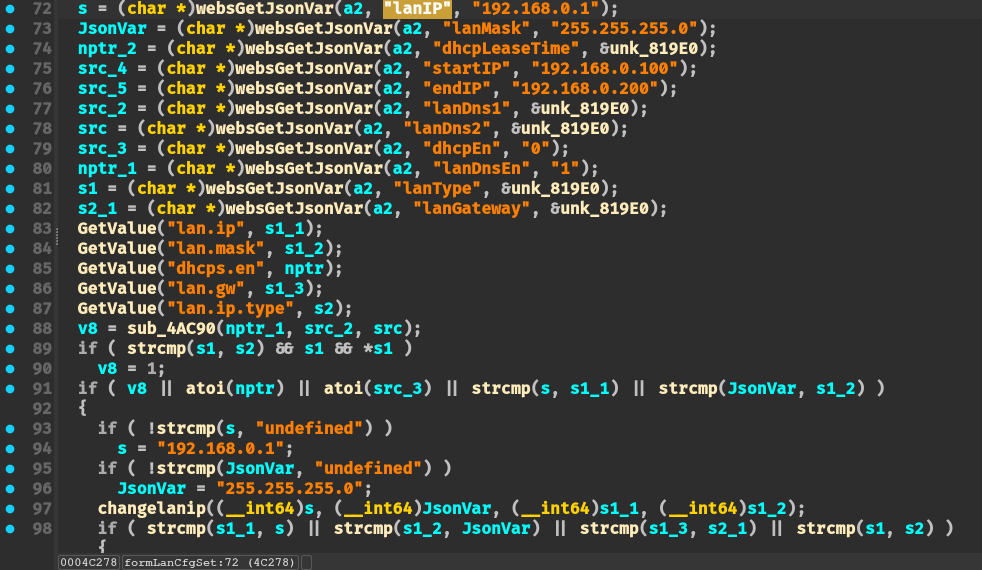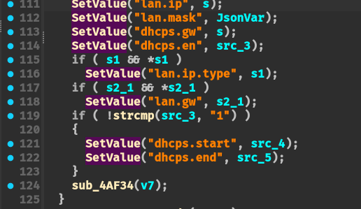 通过 SetValue + GetValue 函数传递 lan.ip 参数,并且没有对 lan.ip 参数进行校验。可以直接通过 SetValue 写入到 flash 中