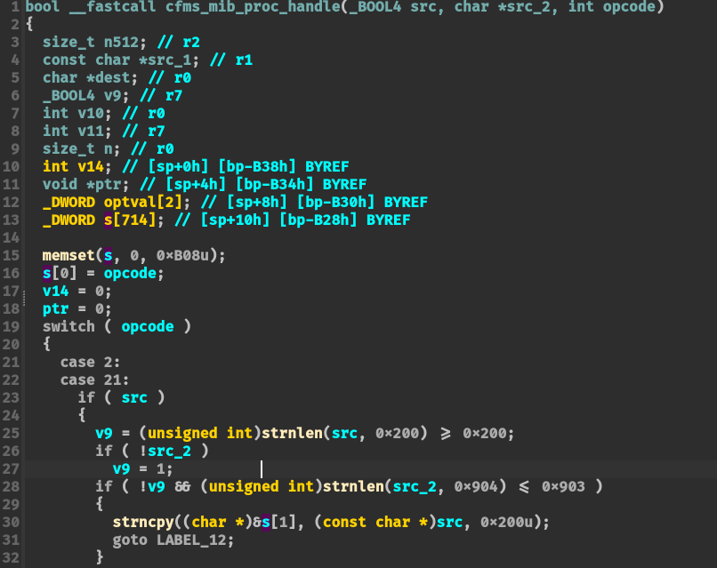 SetValue 函数调用 cfms_mib_proc_handle 函数,对应 opcode = 2,不加校验地将其写入到配置文件: