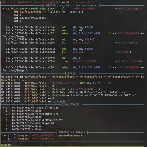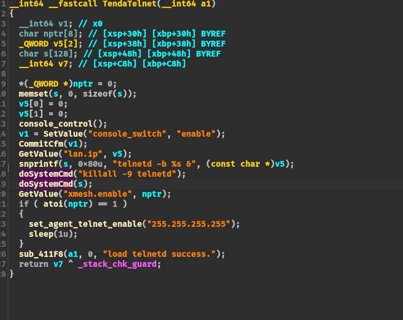 然后在 TendaTelnet 函数中则会使用 GetValue 函数读取 lan.ip 的配置项内容,并将其拼接到 “telnetd -b <lan.ip> &” 命令调用 doSystemCmd 执行命令: