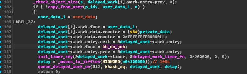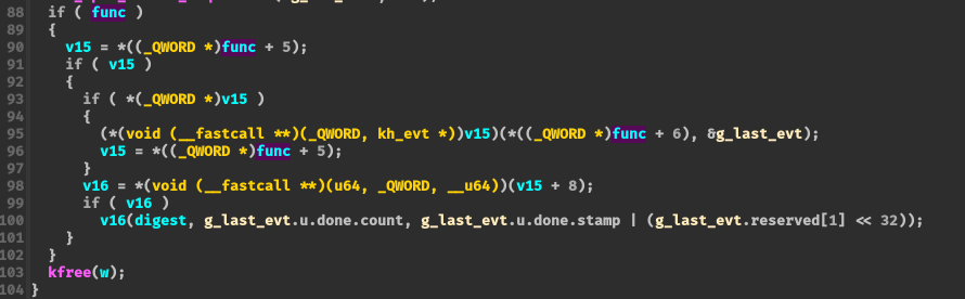 void vuln(uint64_t digest_ptr, uint32_t count, uint32_t delay_time) { struct kh_queue_req req = { .digest_ptr = digest_ptr, .count = count, .delay_time = delay_time}; SYSCHK(ioctl(dev_fd, VULN_CMD, &req)); }