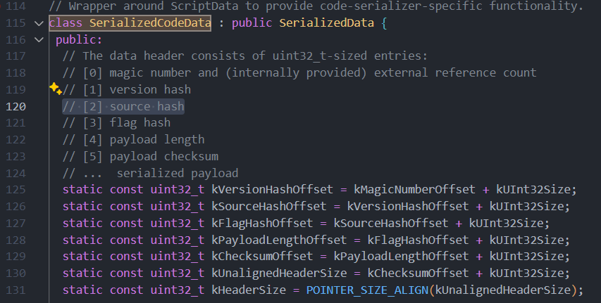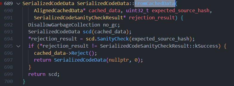 另外一个需要注意的点是runner.cc装载cache时,会提供一个空的script string。cache loader会检查binary cache的hash与script的hash是否相同。通过调试发现,空script的hash值为0,并且binary cache的hash位于+8偏移处,占四字节大小。因此如果要允许cache执行需要控制该域为0。