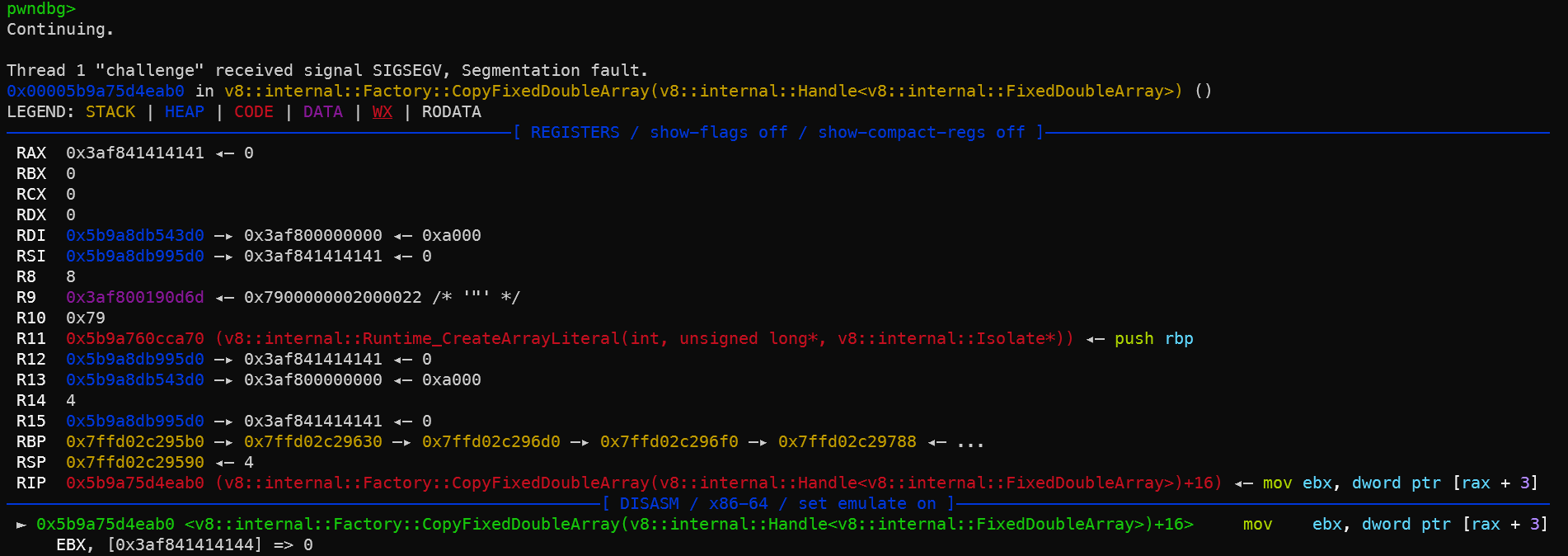 对应的OOB index是通过调试尝试来计算得到的。开始时我们设置unboxed double为AAAA...,然后在gen.cc进程中检查FixedArray后内存。注意我们不能在run.cc中完成以上任务(由于无法打印字节码),但是两个内存布局很相似。然后可以将其作为CreateArrayLiteral的索引值,然后运行./challenge程序。如果发生0x????41414141的crash,则表明发生了OOB。