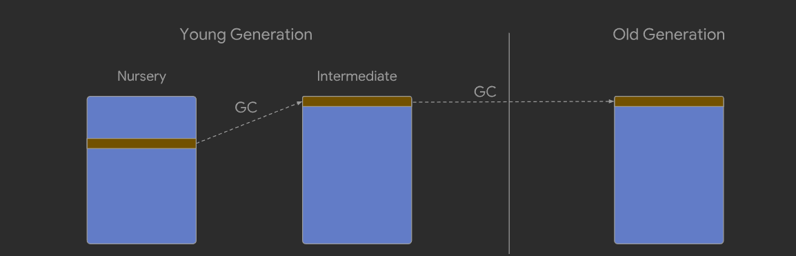 初始申请对象的堆内存时,将其申请在nursery空间。如果在下一次GC后,该对象仍然标记为存活,则将其移动到intermediate区域。如果再一次GC后,该对象仍然存活,则将其移动到老生代区域。(基于大部分申请对象的存活周期都比较短的现象)。