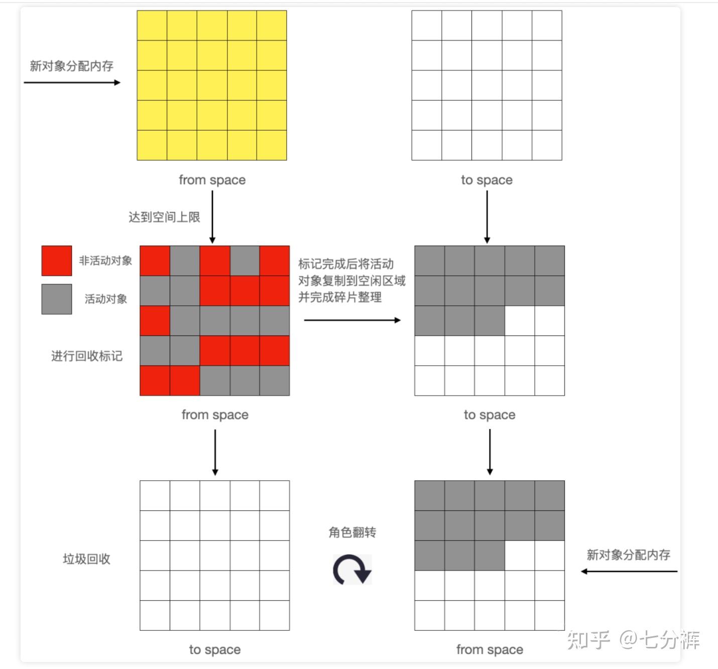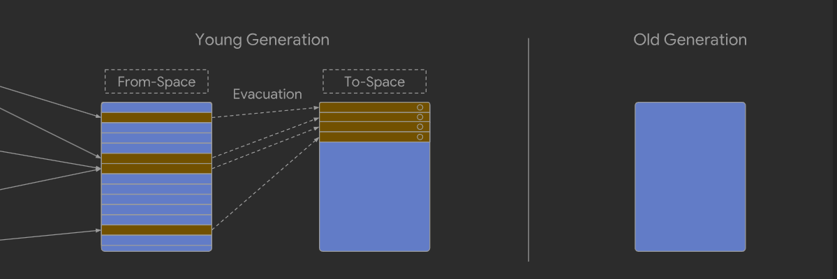 Evacuation:将所有存活对象移动到一段连续内存,可以解决内存分片的问题。然后将两个空间翻转重新开始下一轮gc。