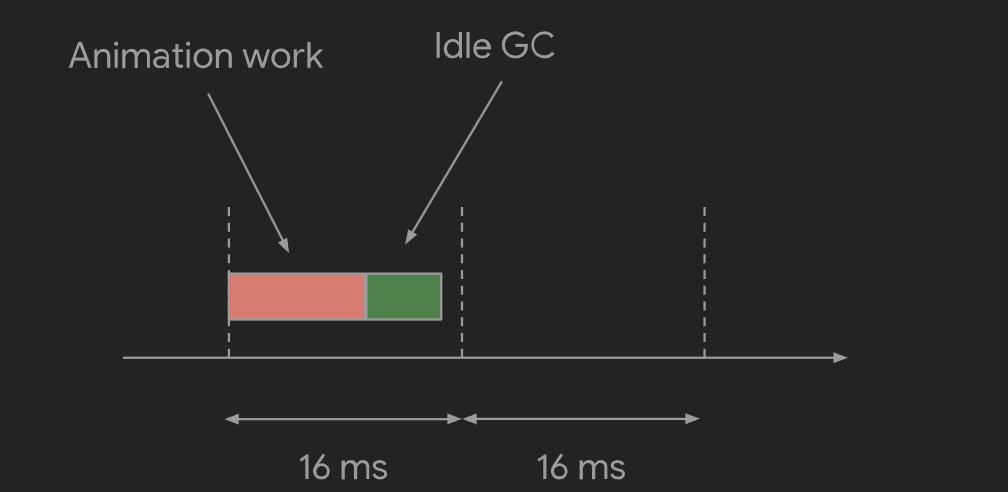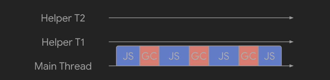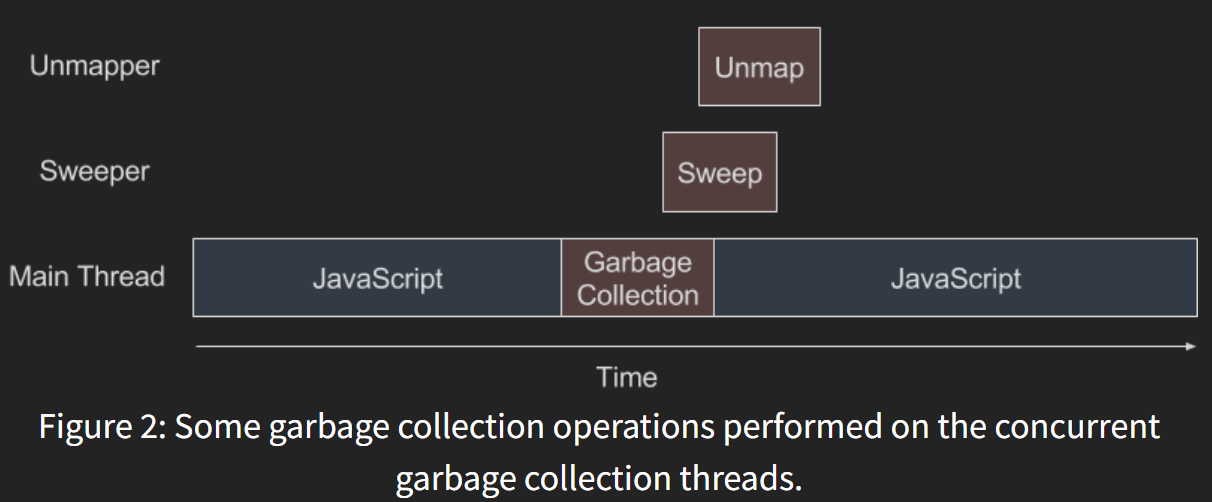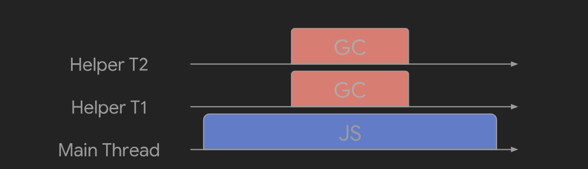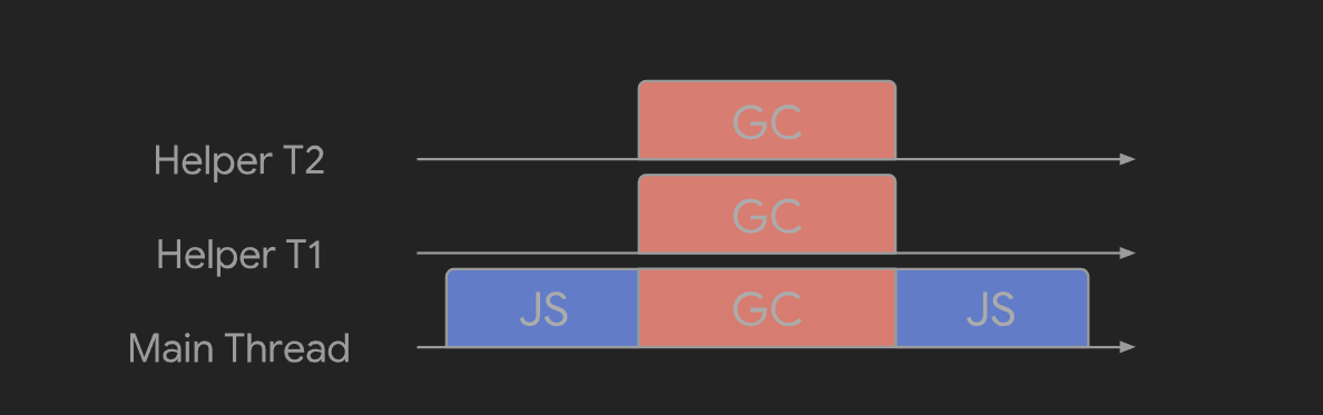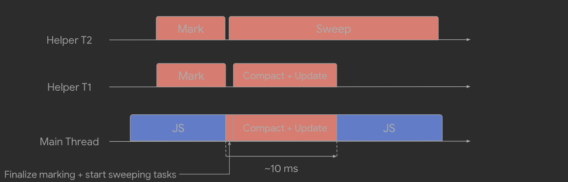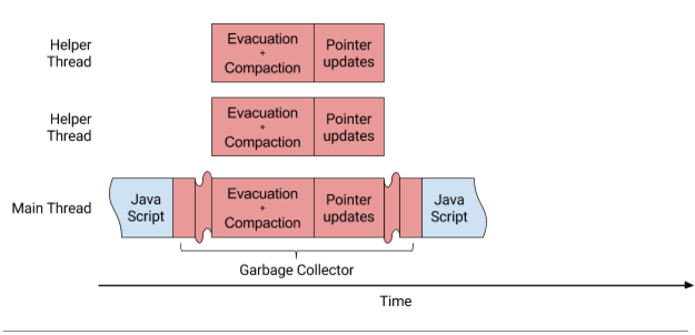 上图为最简单的版本,将Major GC 分为三个阶段: marking, sweeping和compacting,存在很大的延迟,影响性能。