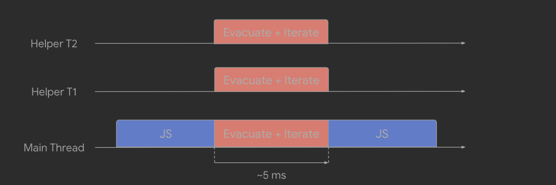 弊端:需要复制大量的存活对象,因此仅当内存页分片比较严重时才会这样做。其他情况则仅做sweeping操作。