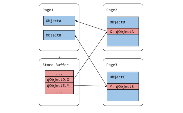 在scavenge过程中,需要额外维护一个根集合(Old-to-young generation references:老生代的指针引用新生代的对象)。使用remebered set、write-barriers来维护该集合。
