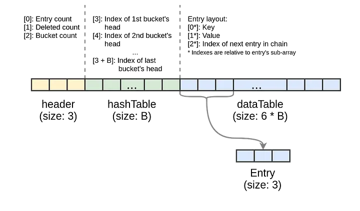 保存在堆上。整个Map对象保存在一个固定长度的数组(一个元素占用8字节)上。数组由如下布局: